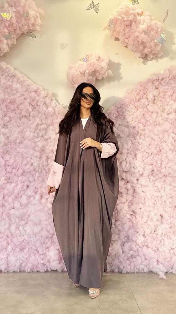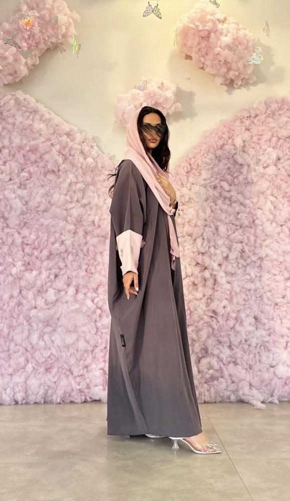 عباية نص بشت كريب مغسول رمادي ووردي مع فراشات على الكم
