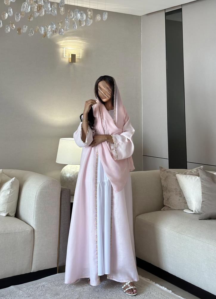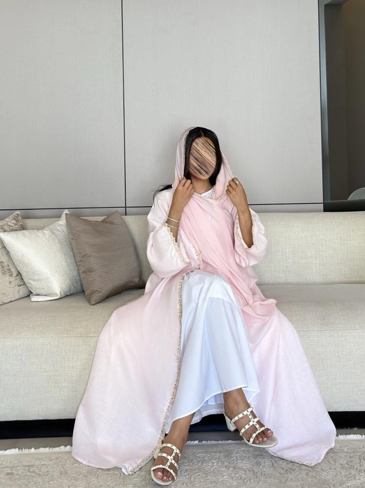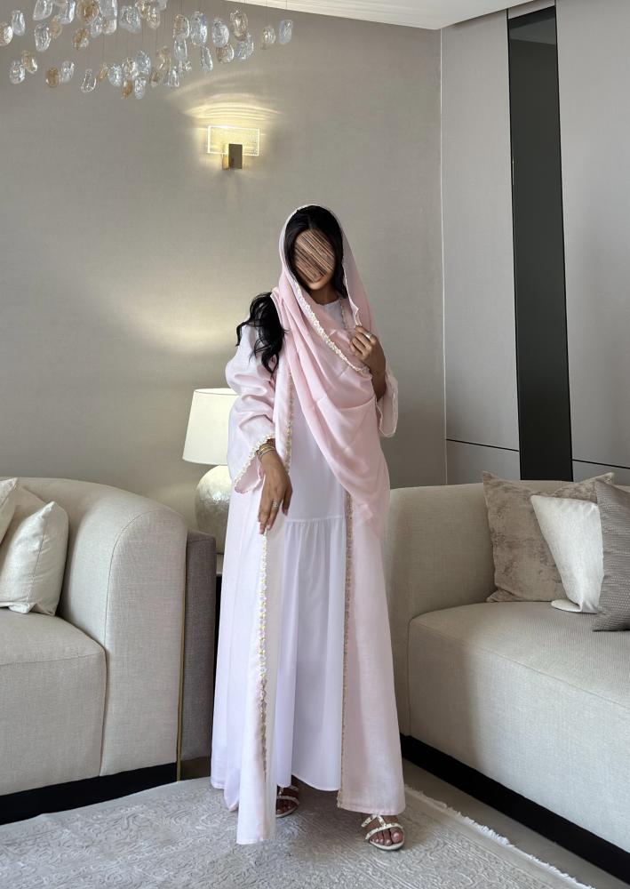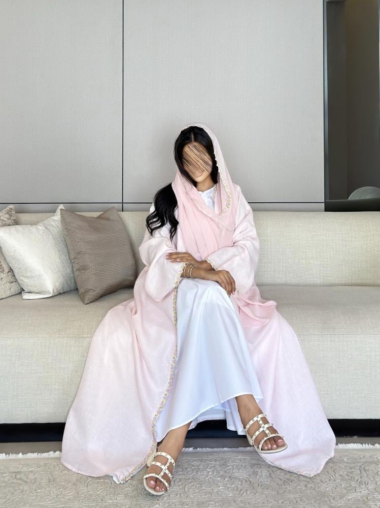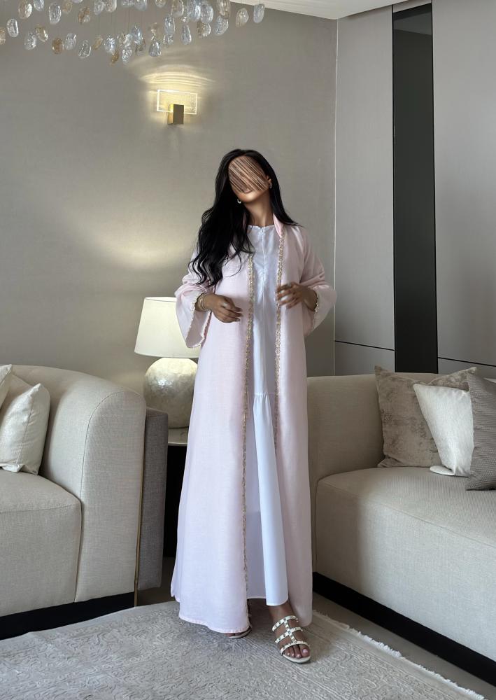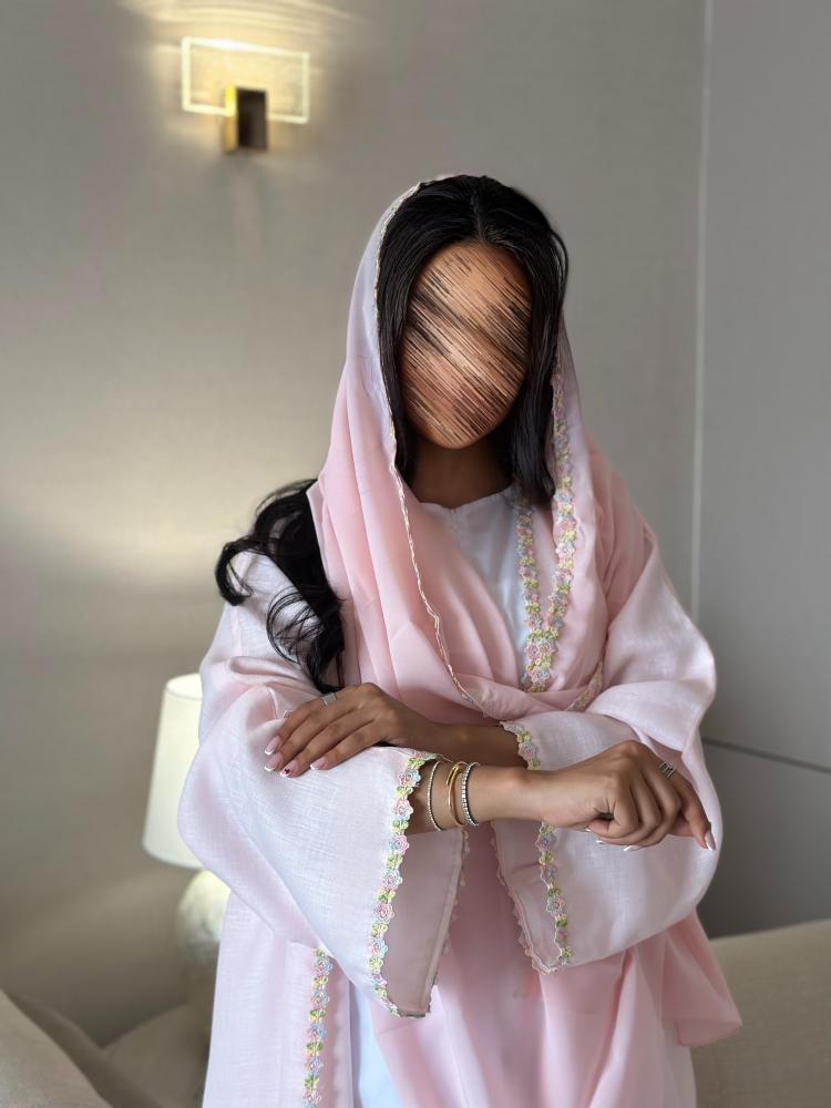 عباية لنن هندي وردي مع كلفة ورد ملون نص :
