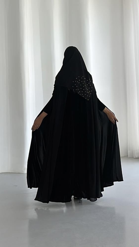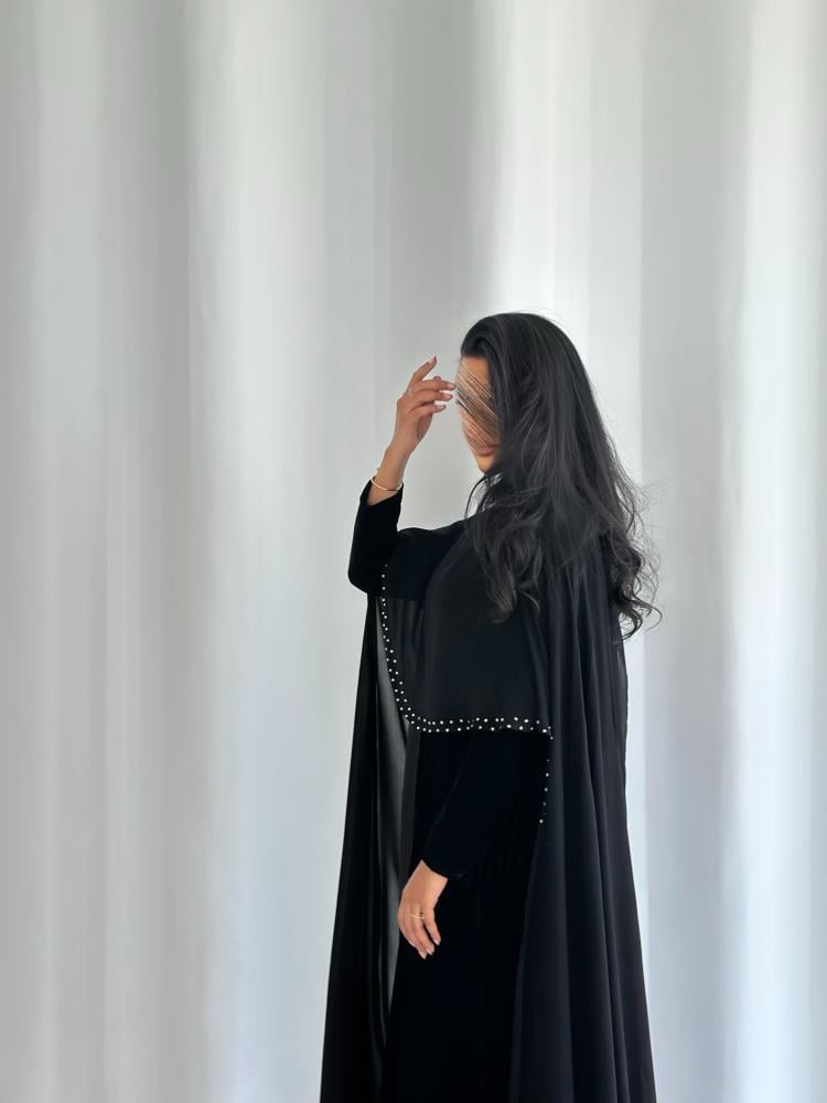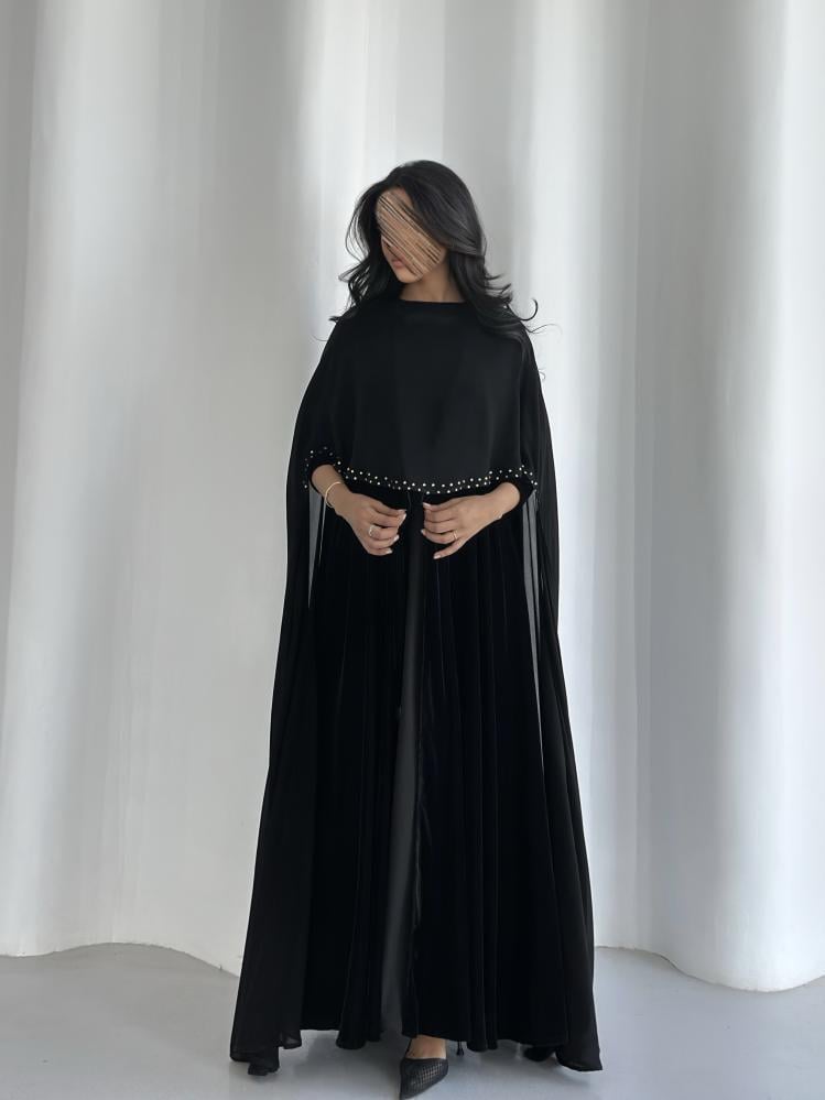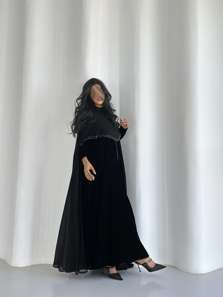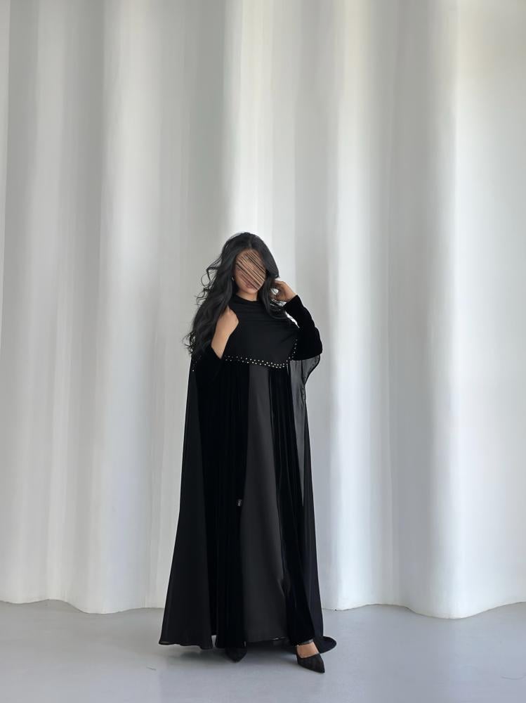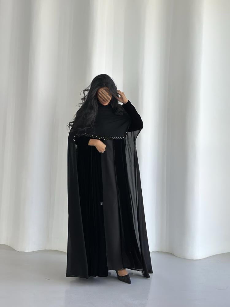 عباية مخمل اسود مع شال مرصع بالكريستال